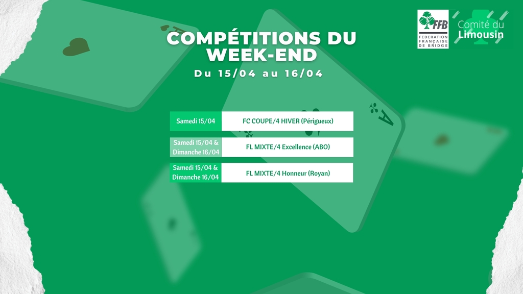 Nous sommes heureux de vous annoncer la tenue de trois compétitions de Bridge dans la région, incluant deux finales de ligue et une finale du Comité du Limousin.