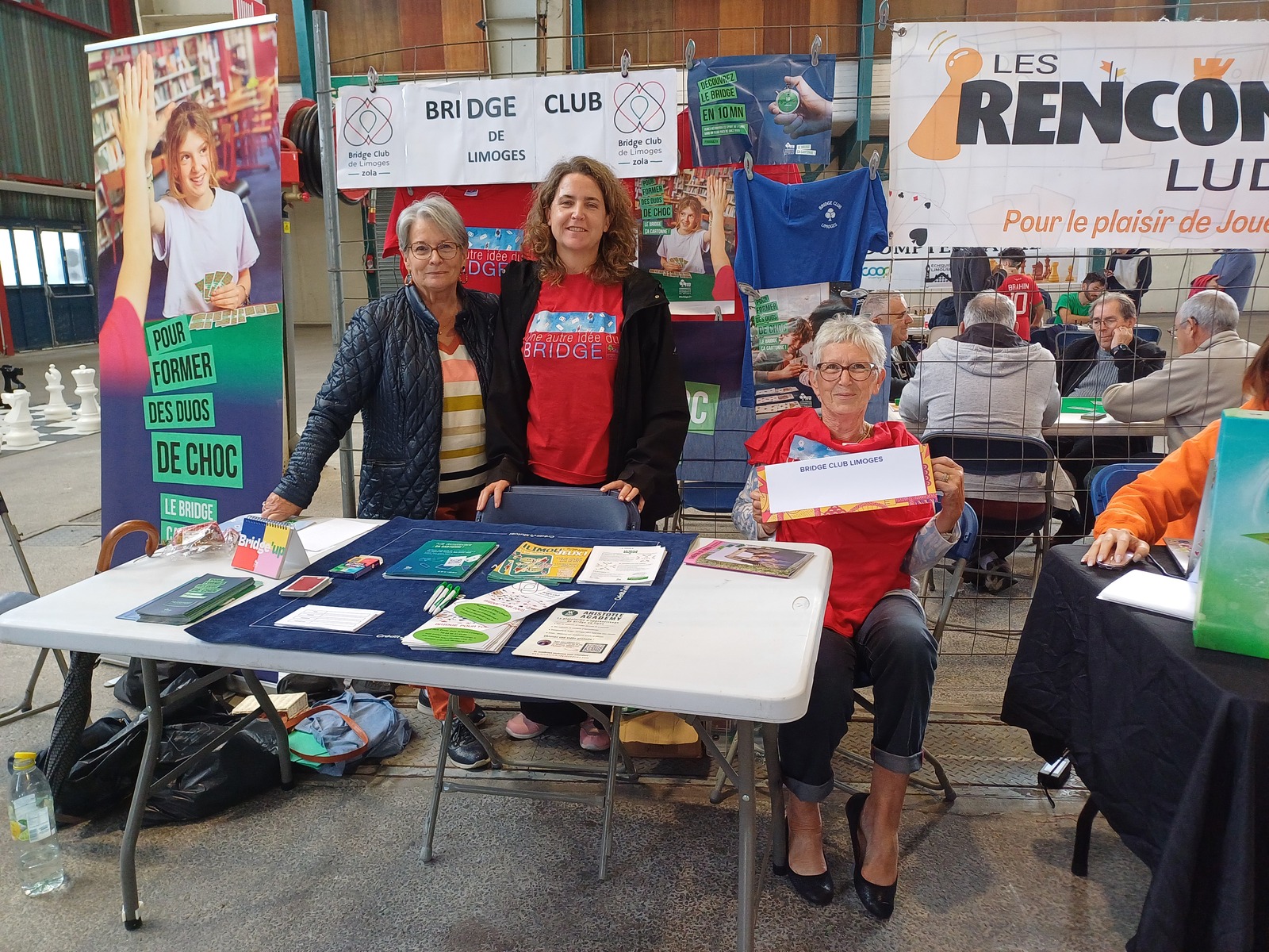 Gaëlle Beineix accompagnée de Christiane Boutet vice-Présidente du Club de Limoges-Zola et Christiane Schmitt Présidente d'Honneur du club de Limoges-Zola ont acceuilli les visiteurs. De nombreux joueurs du Bridge Club de Limoges-Zola sont également venu donner un coup de cartes pour animer le stand.