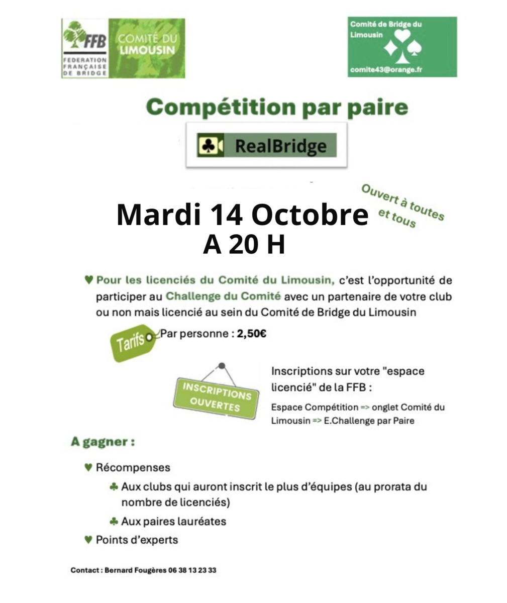 Le Comité de Bridge du Limousin organise un nouveau Challenge par paires sur RealBridge, ouvert à tous les passionnés de la région ! Une belle occasion de se mesurer en ligne dans une ambiance conviviale, tout en profitant d’une organisation sérieuse et dynamique.